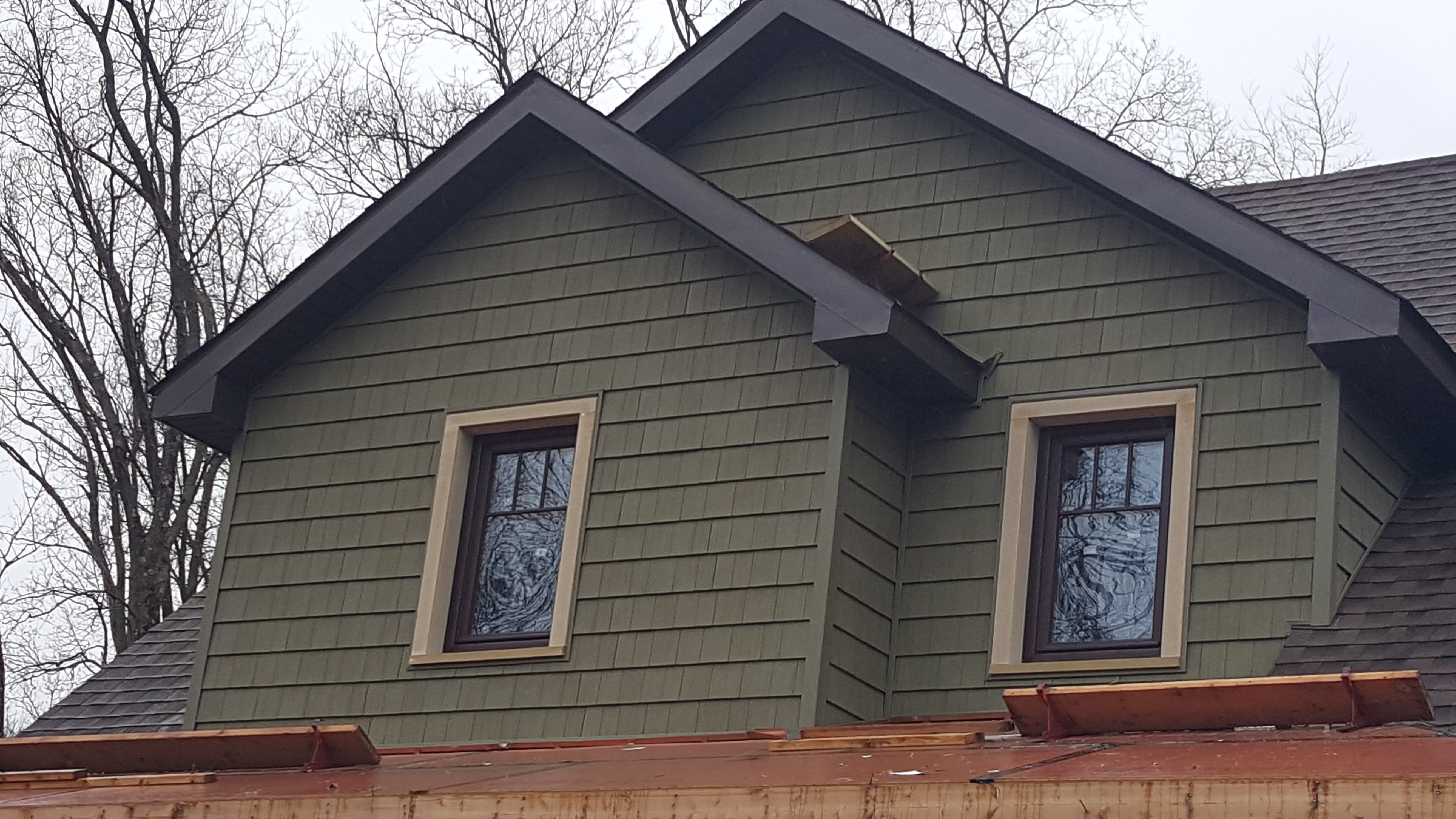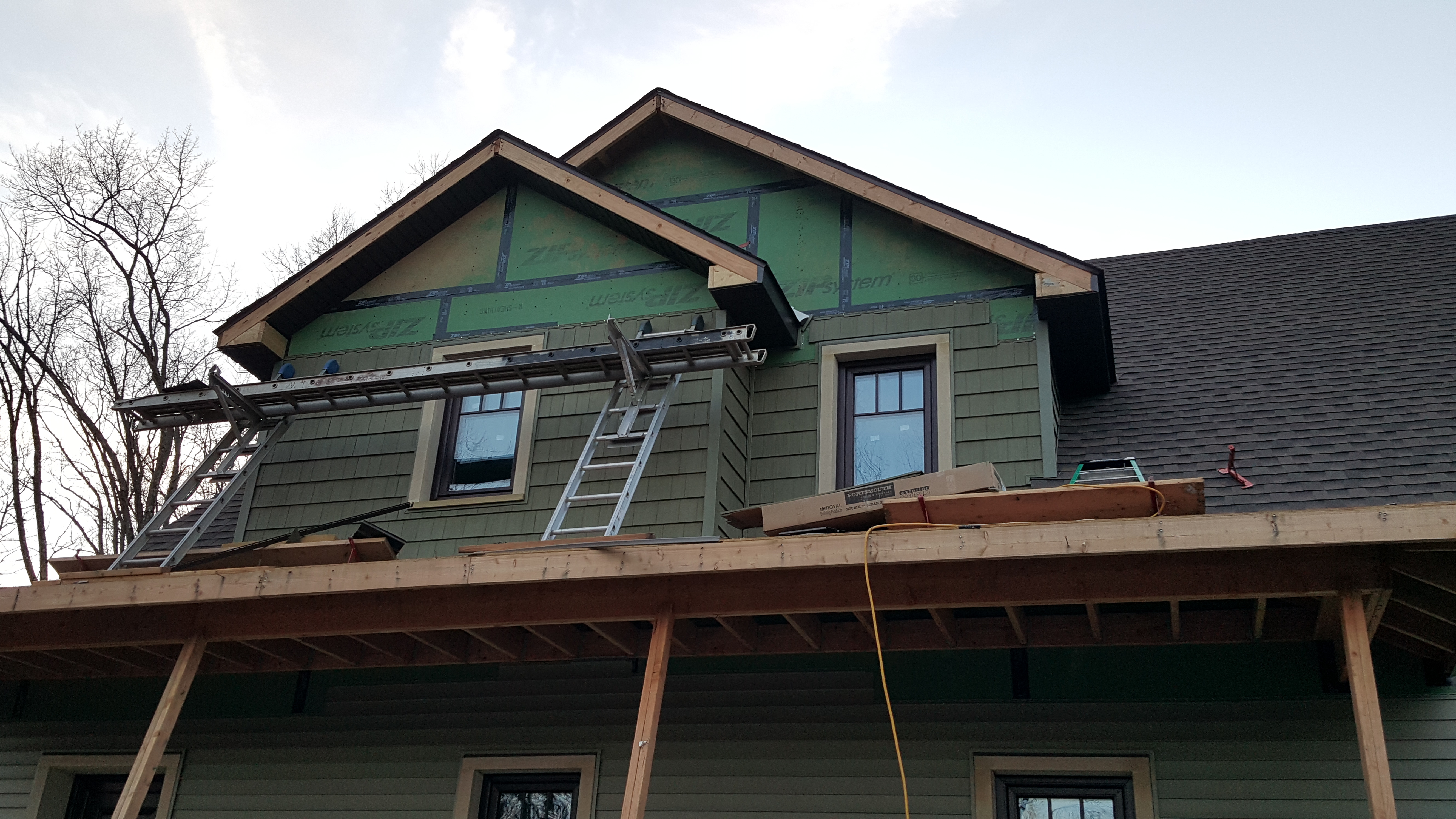 With the porch deck poured we could start the siding and get it looking like a finished house. But again the cold weather got to us, so cold the siding was brittle and would brake. The siders had to take a brake and come back after the cold snap moved on.